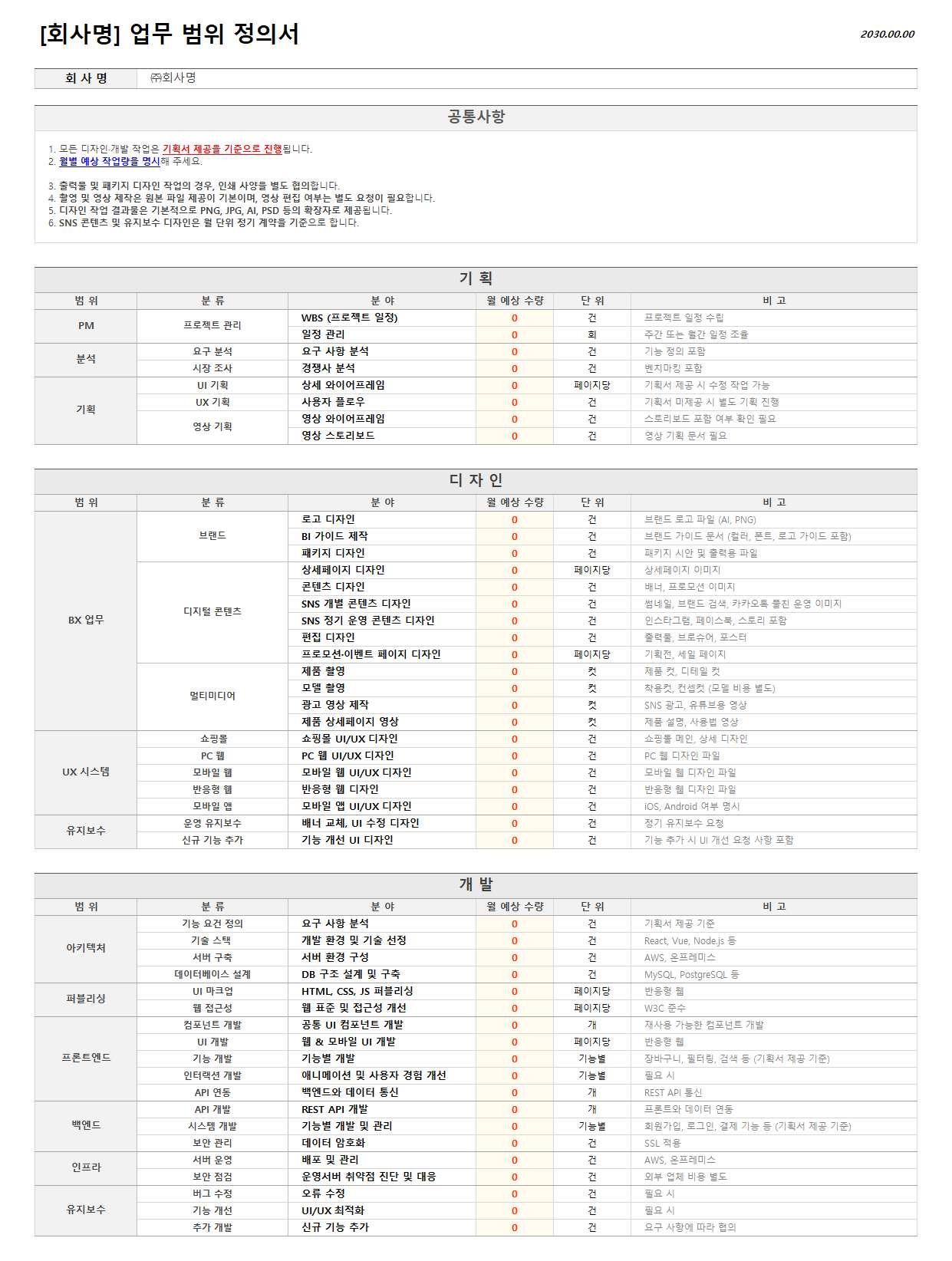 📝 [회사명] 업무 범위 정의서(기획,디자인,개발)