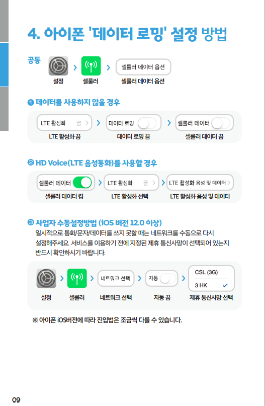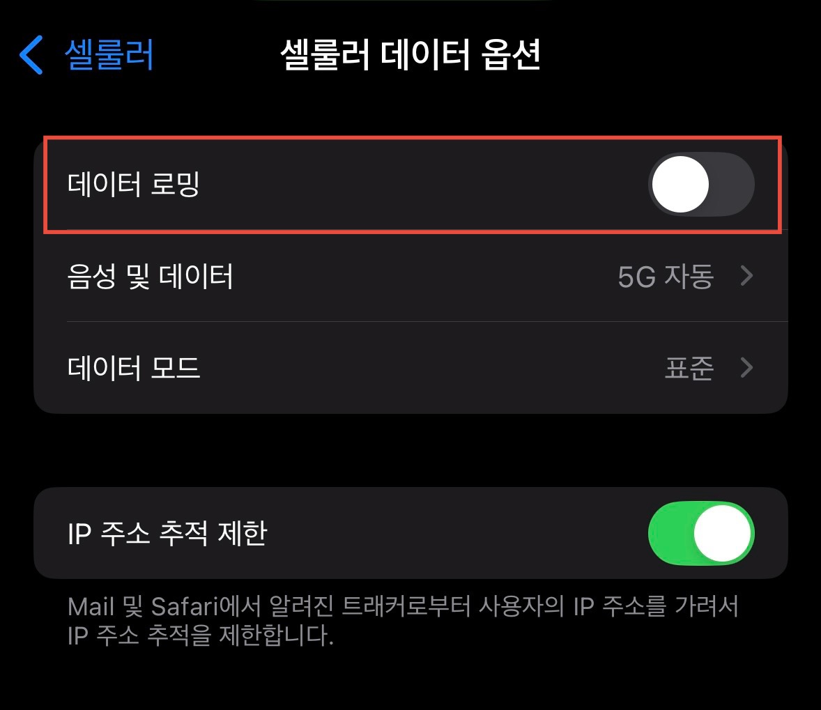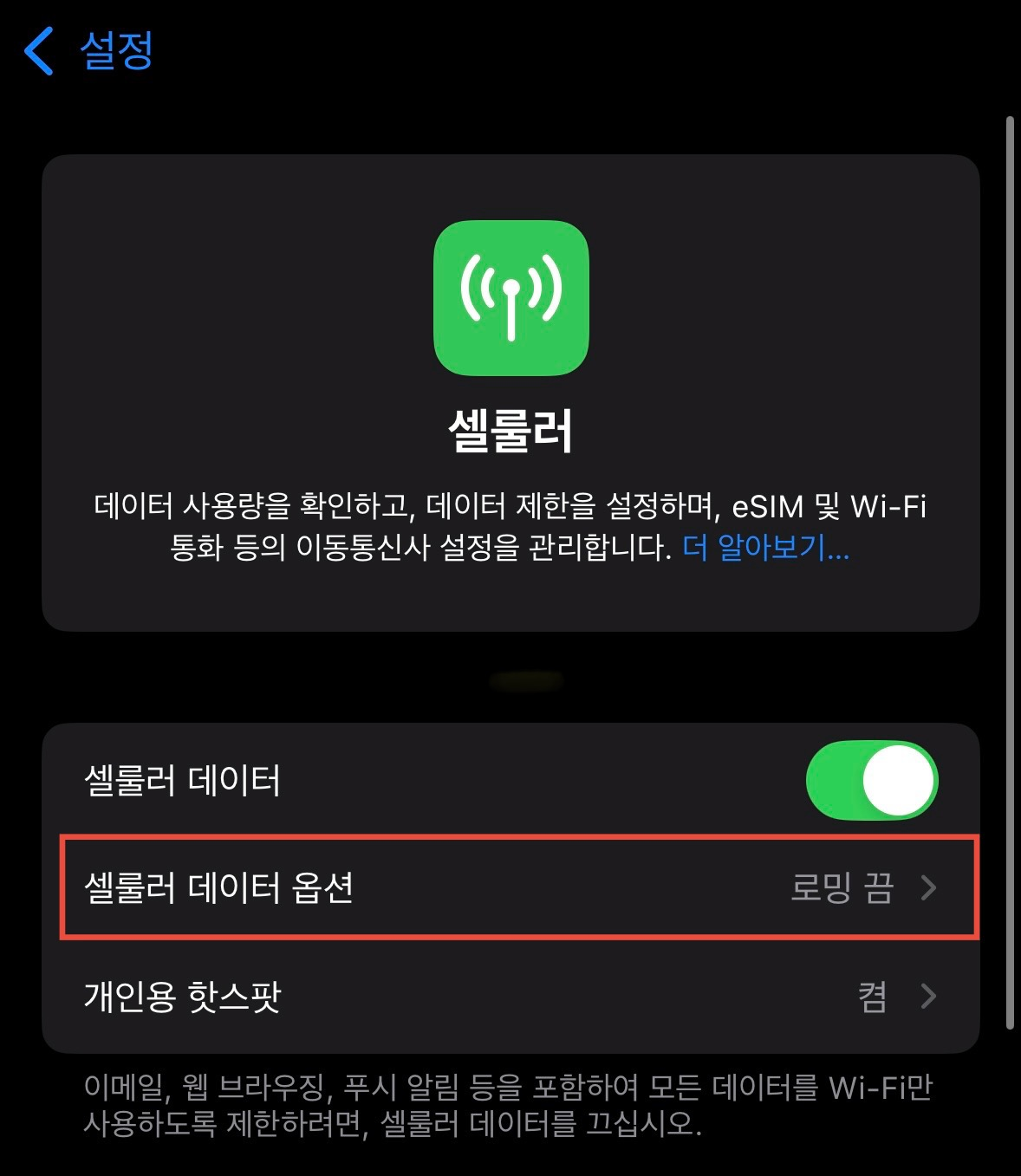 1️⃣ 설정 → 셀룰러 → 셀룰러 데이터 옵션 → "데이터 로밍" 활성화