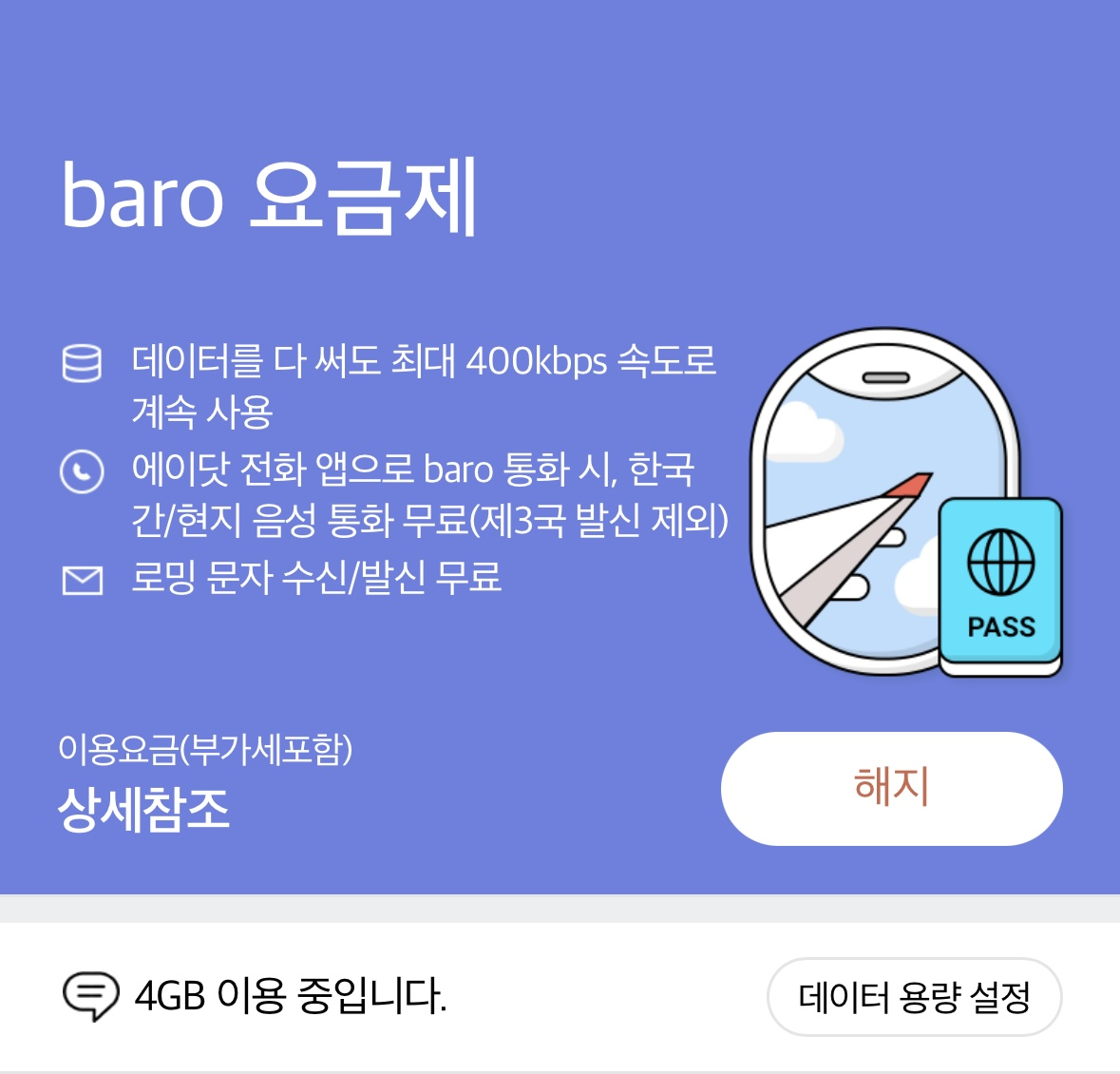 | baro 3GB | 29,000원 | 최대 30일 | 3GB (소진 시 400kbps 속도 유지) |