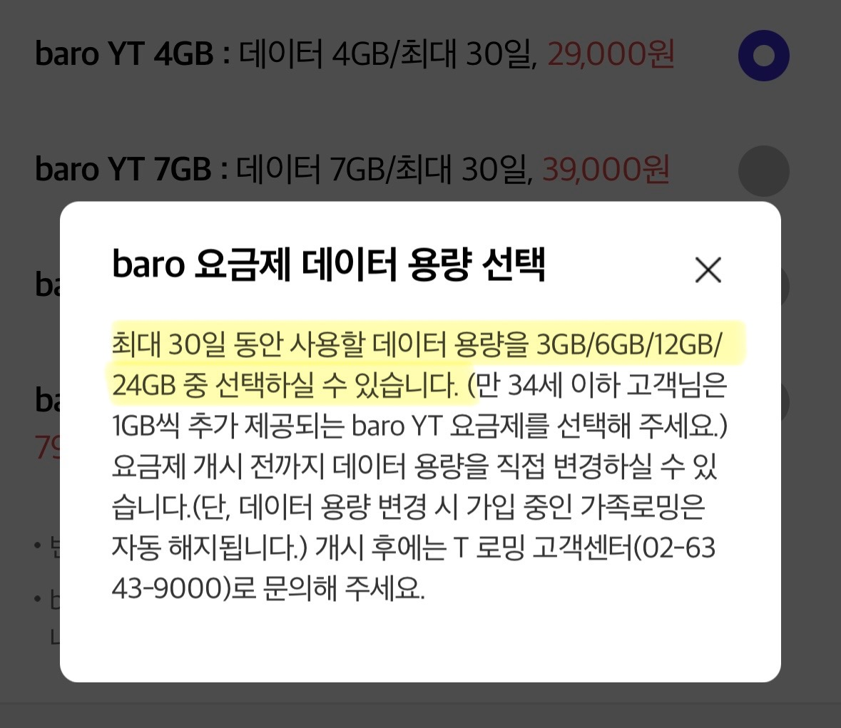 | baro 6GB | 39,000원 | 6GB (소진 시 400kbps 속도 유지) |
