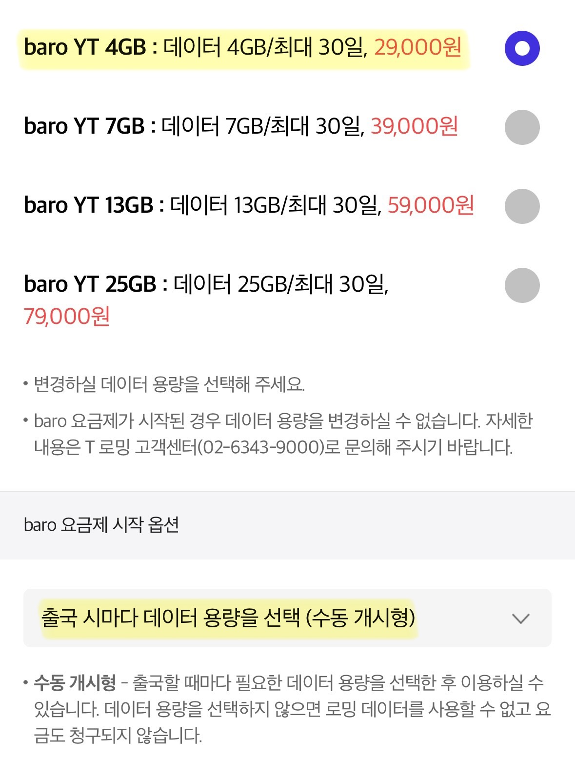 - 수동 개시형 : 출국 시 원하는 데이터 용량 선택 후 사용 (미선택 시 요금 청구 없음)