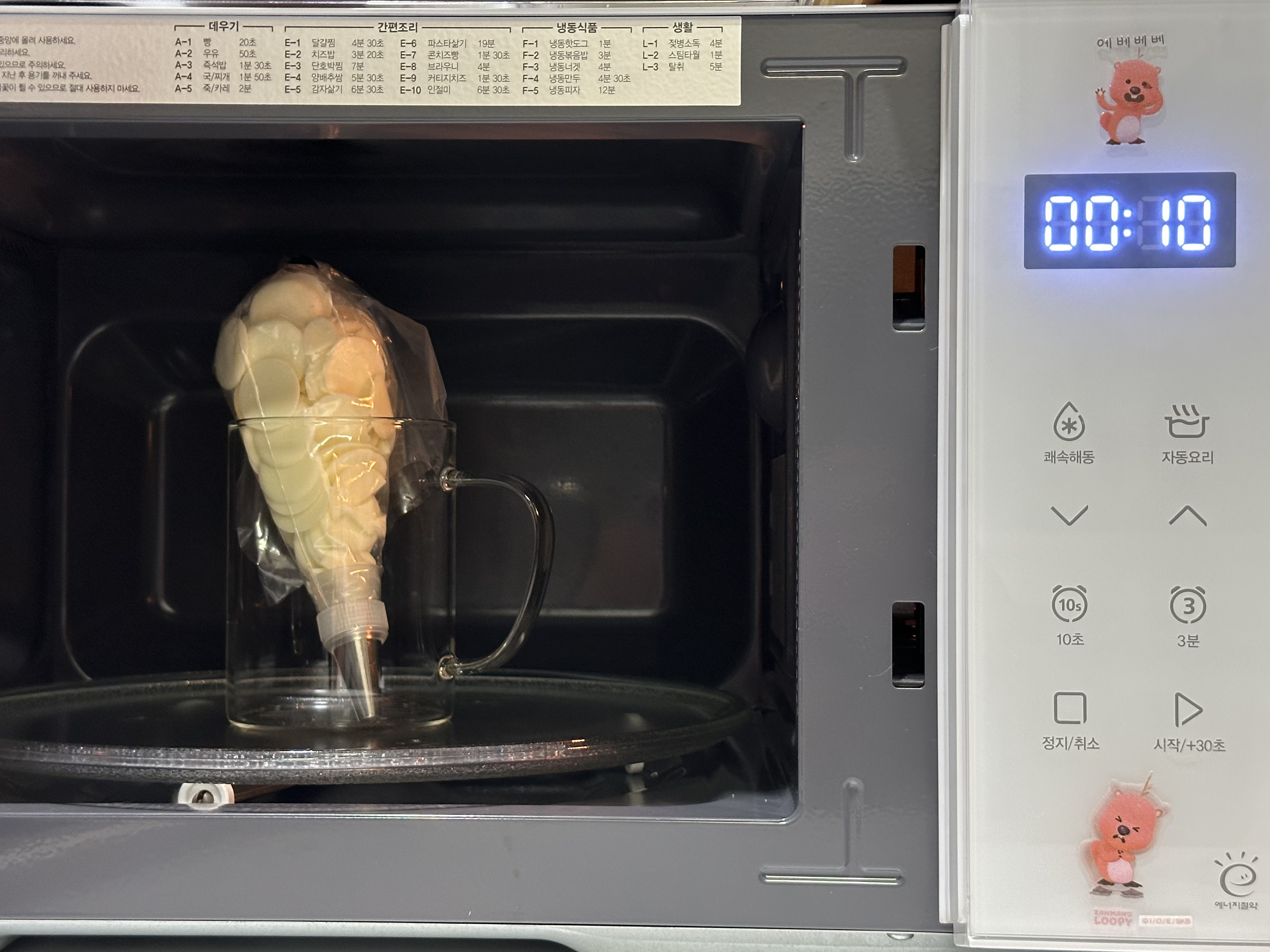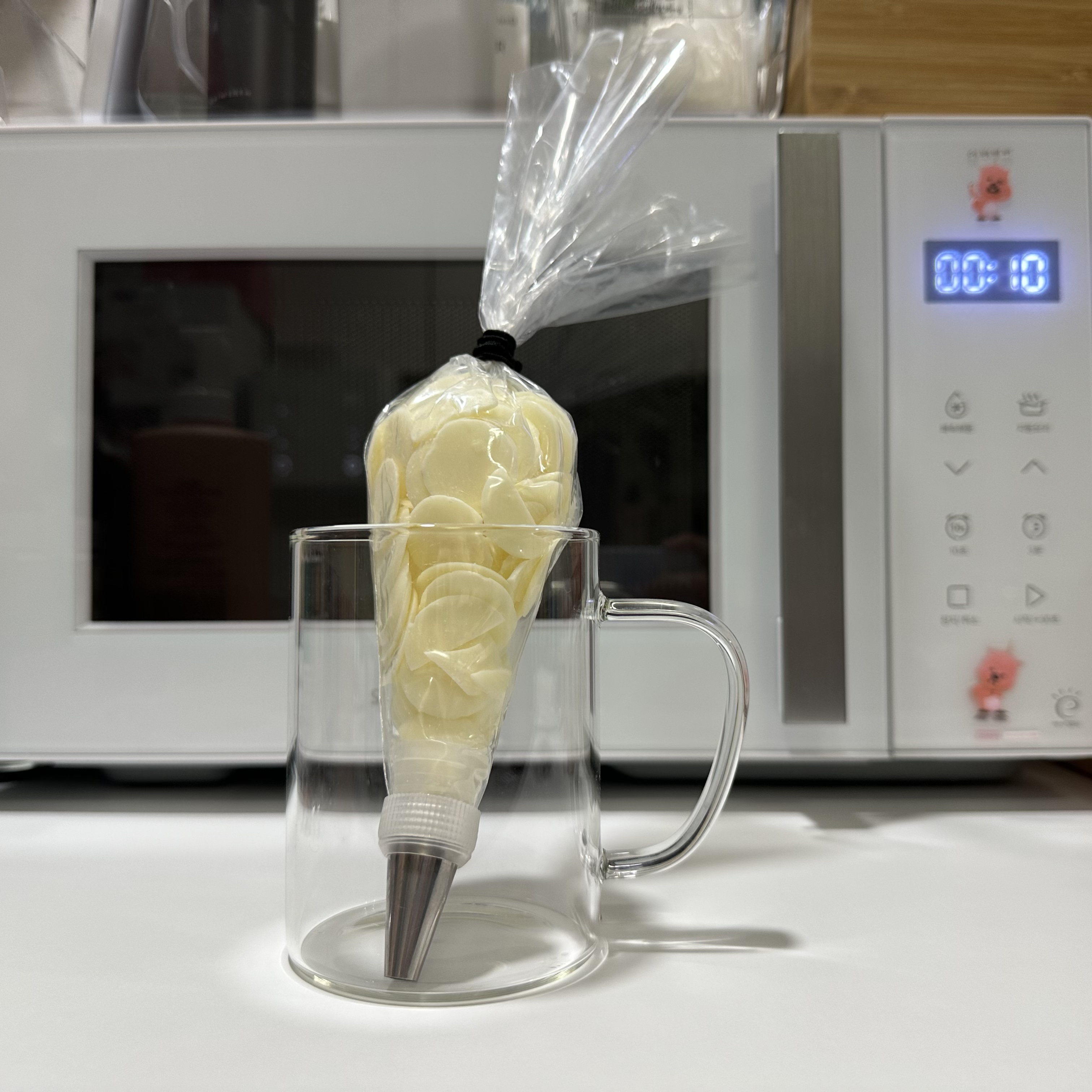 짤주머니를 전자레인지용 컵에 넣고 10초씩 가열하며 녹입니다.
