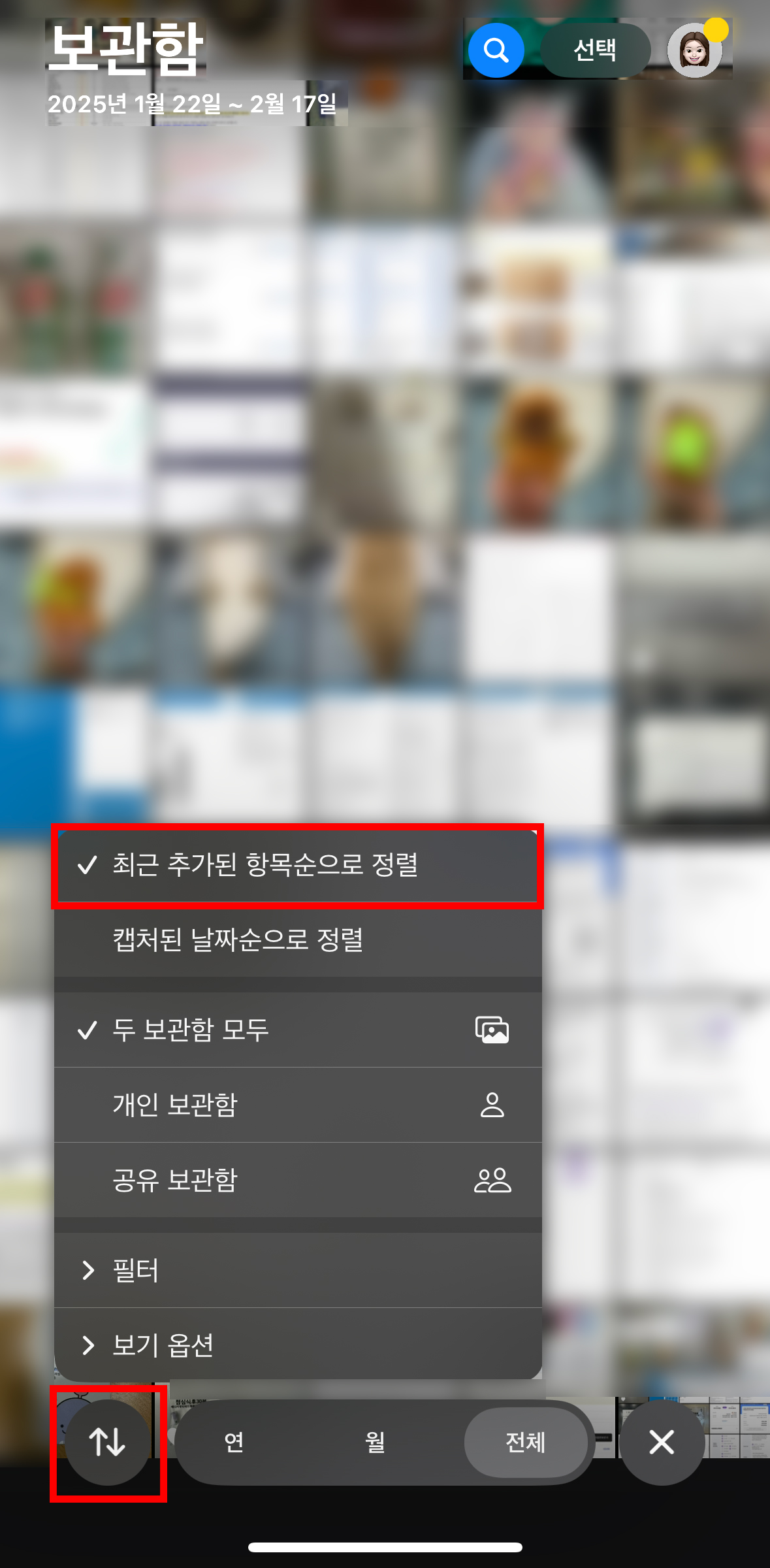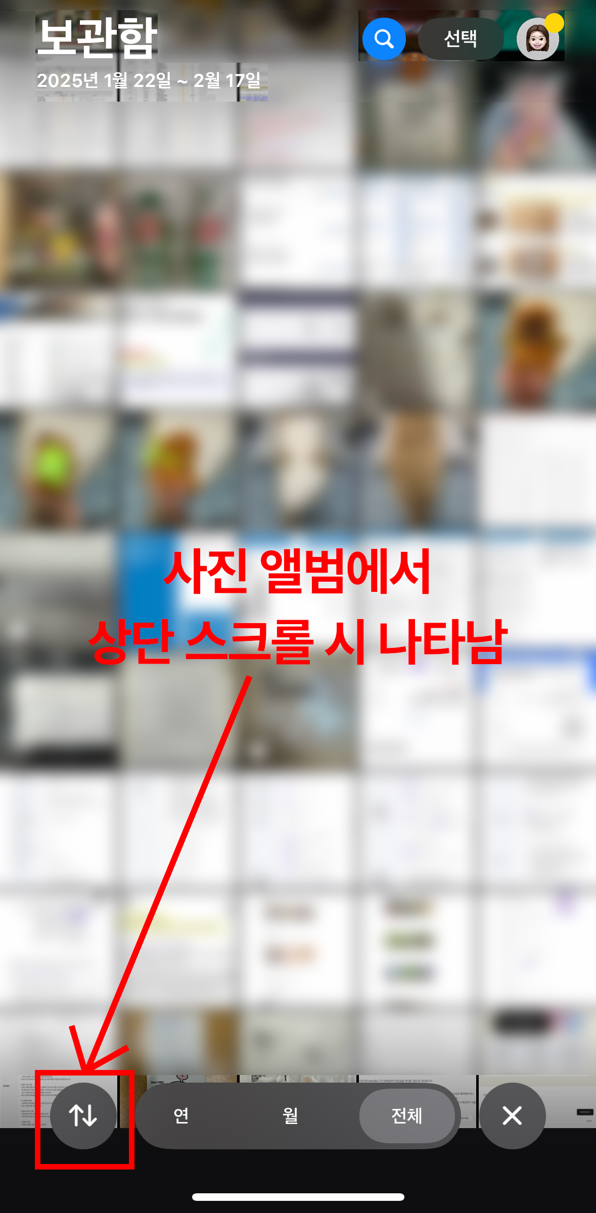 ✅ 사진 앱 ▶ 사진 갤러리 스크롤 ▶ ↑↓ ▶ 최근 추가된 항목순으로 정렬