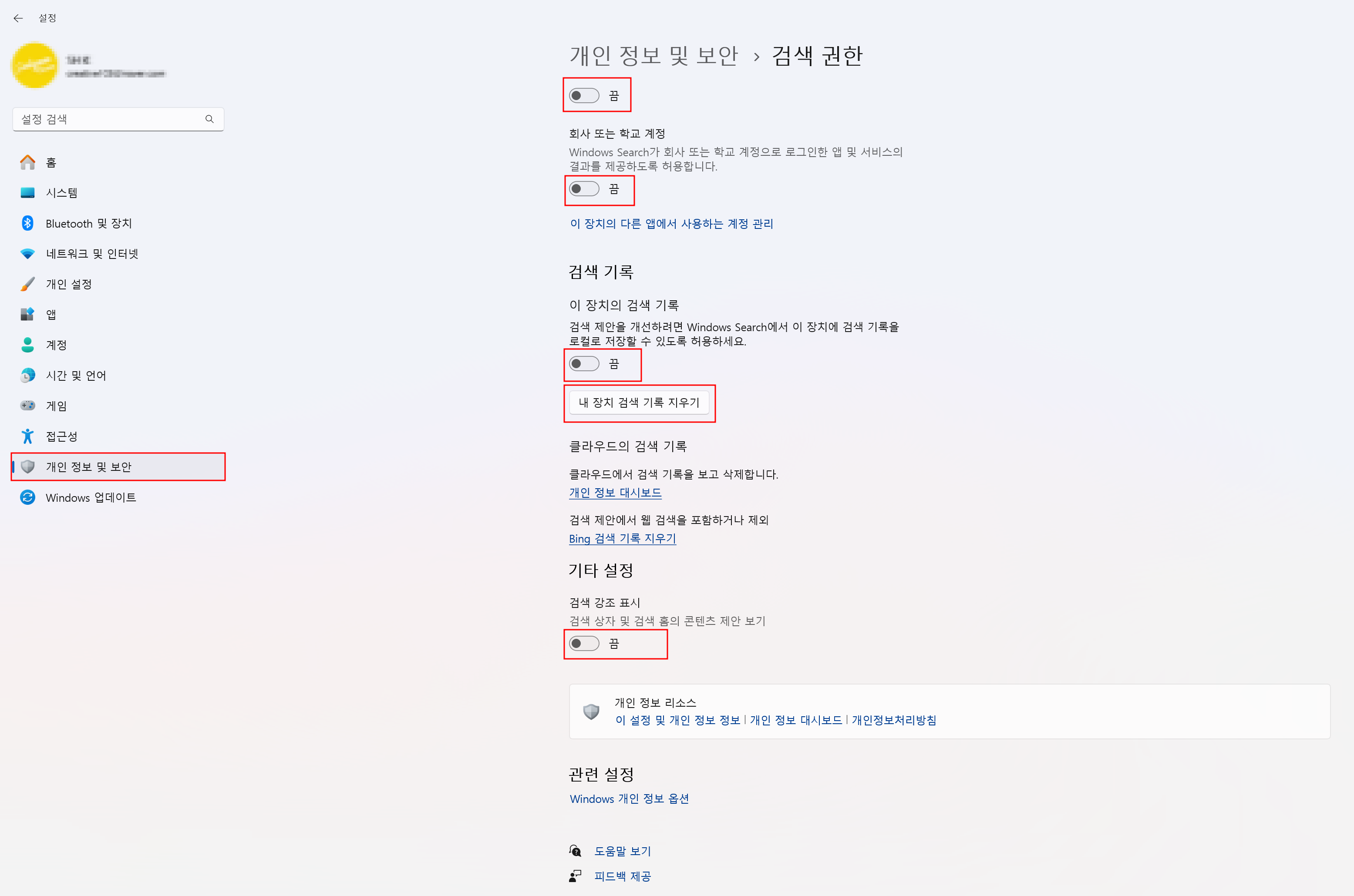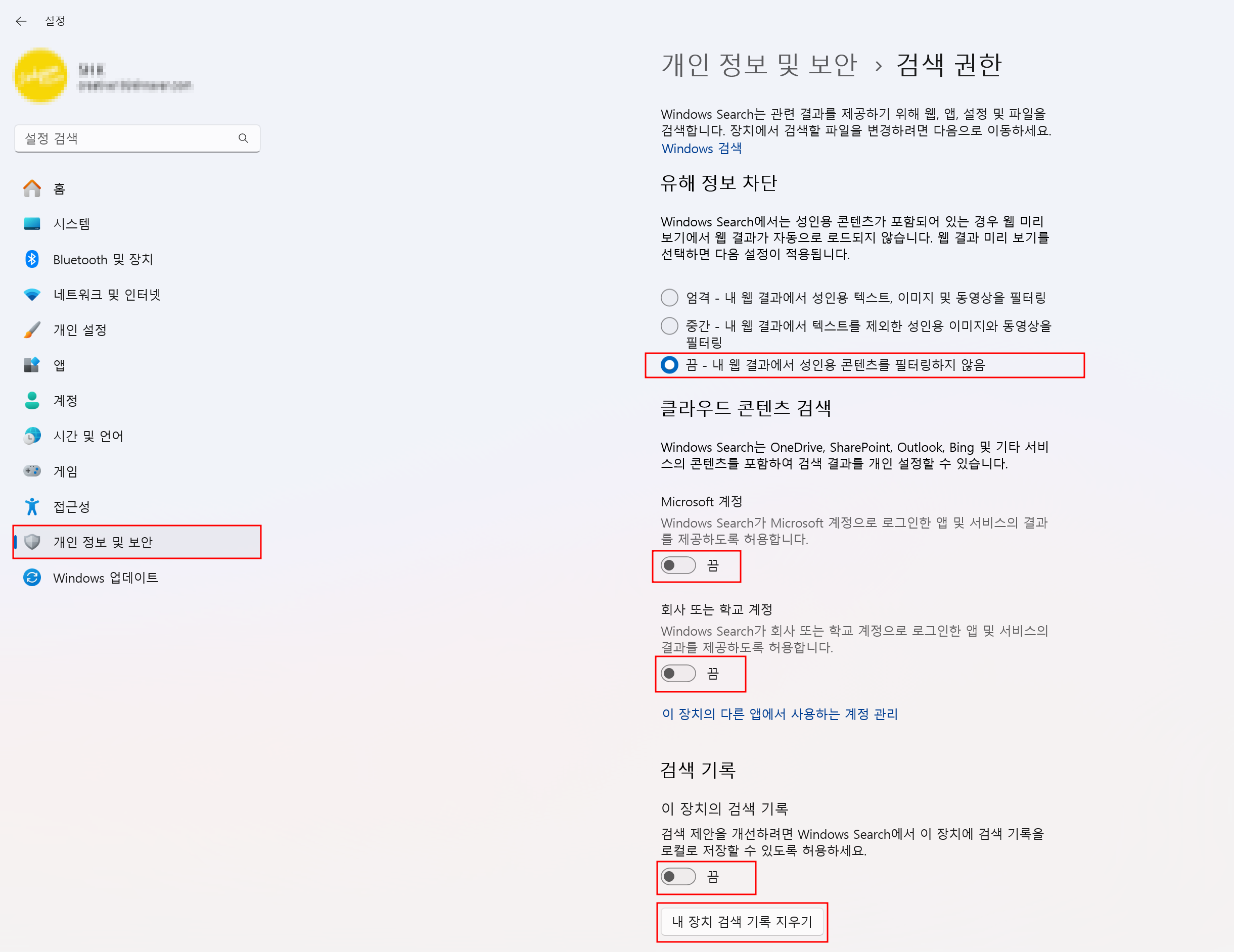 ✅ 설정 ▶ 개인 정보 및 보안 탭 ▶ 검색 권한