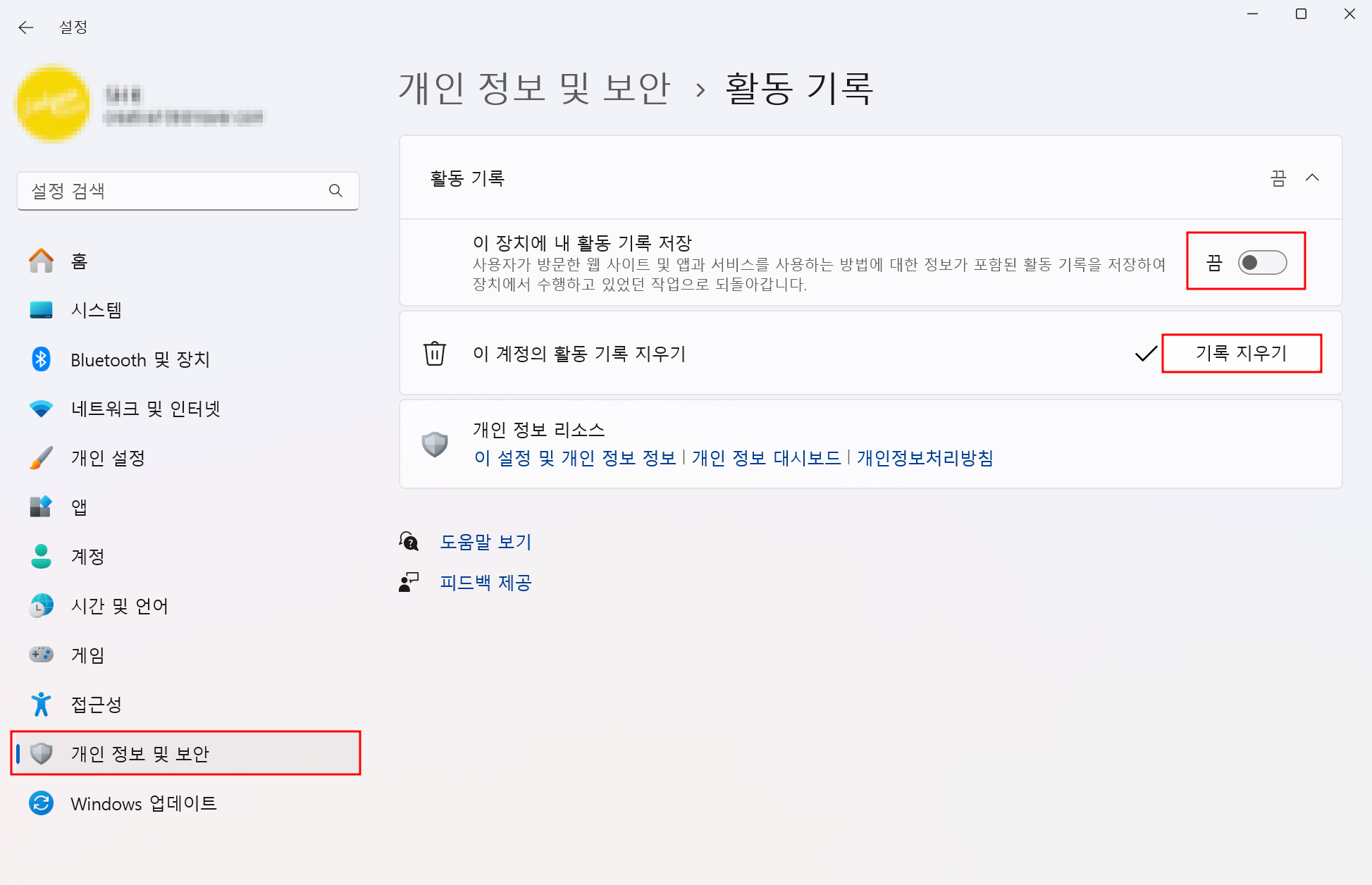 ✅ 설정 ▶ 개인 정보 및 보안 탭 ▶ 활동 기록