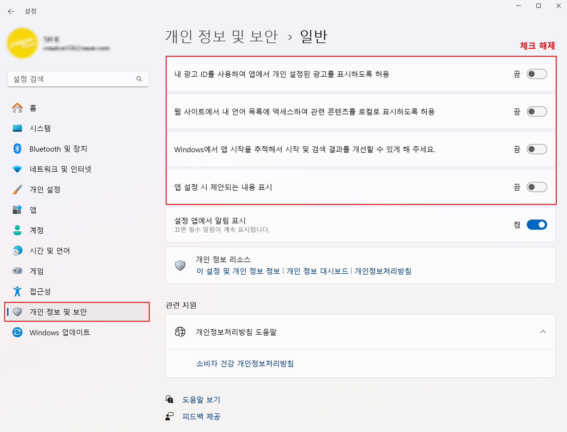 ✅ 설정 ▶ 개인 정보 및 보안 탭 ▶ 일반