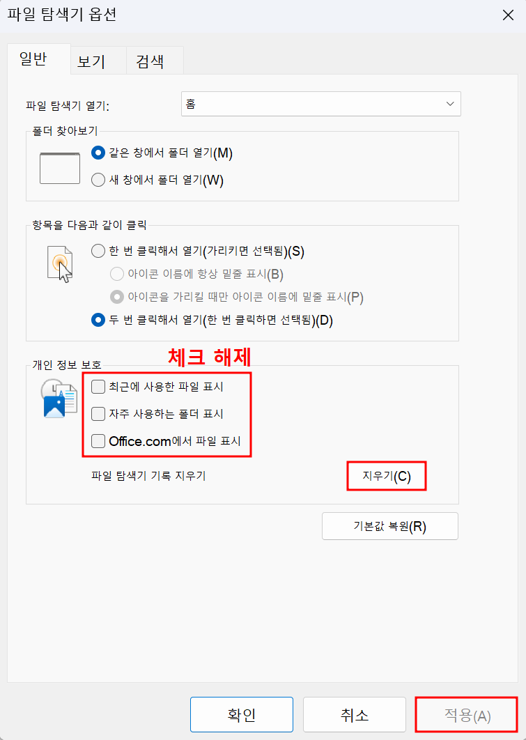 '개인 정보 보호' 체크 해제, '파일 탐색기 기록 지우기' 지우기 클릭 후 적용