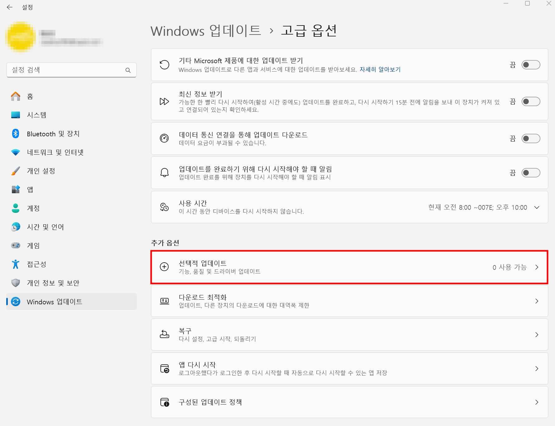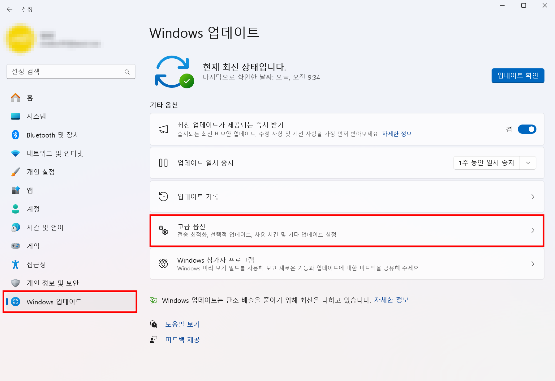1. 설정 ▶ Windows 업데이트 탭 ▶ 고급 옵션