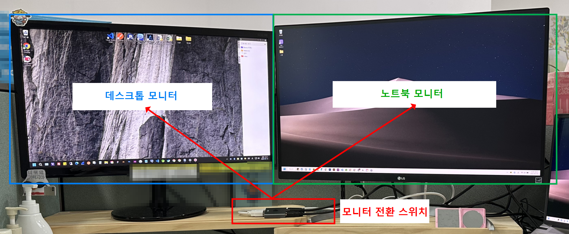 모니터 전환 스위치로 데스크탑과 노트북을 듀얼 모니터로 연결했으나,