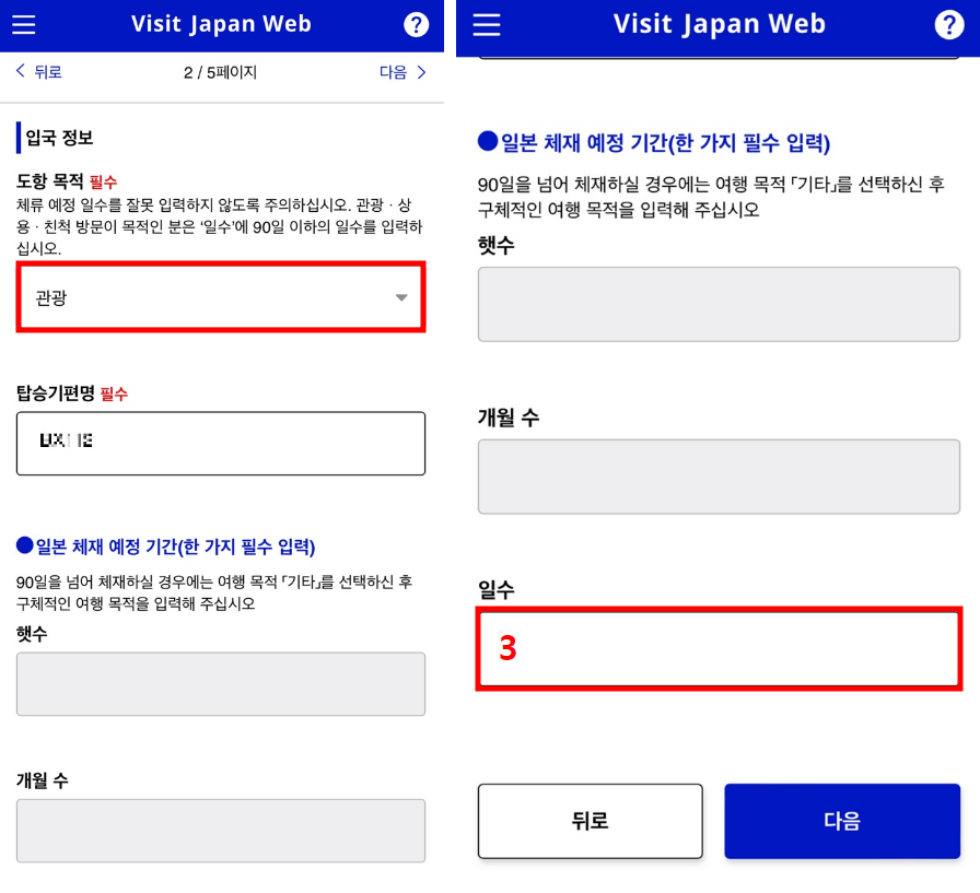 도항 목적을 "관광" 선택 후 체류 일수 입력합니다.