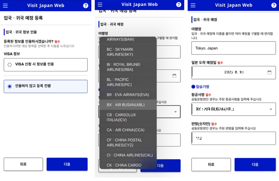 항공사명 알파벳, 편명 숫자 입력해야 하며, 출발지는 본인이 출발하는 공항 선택