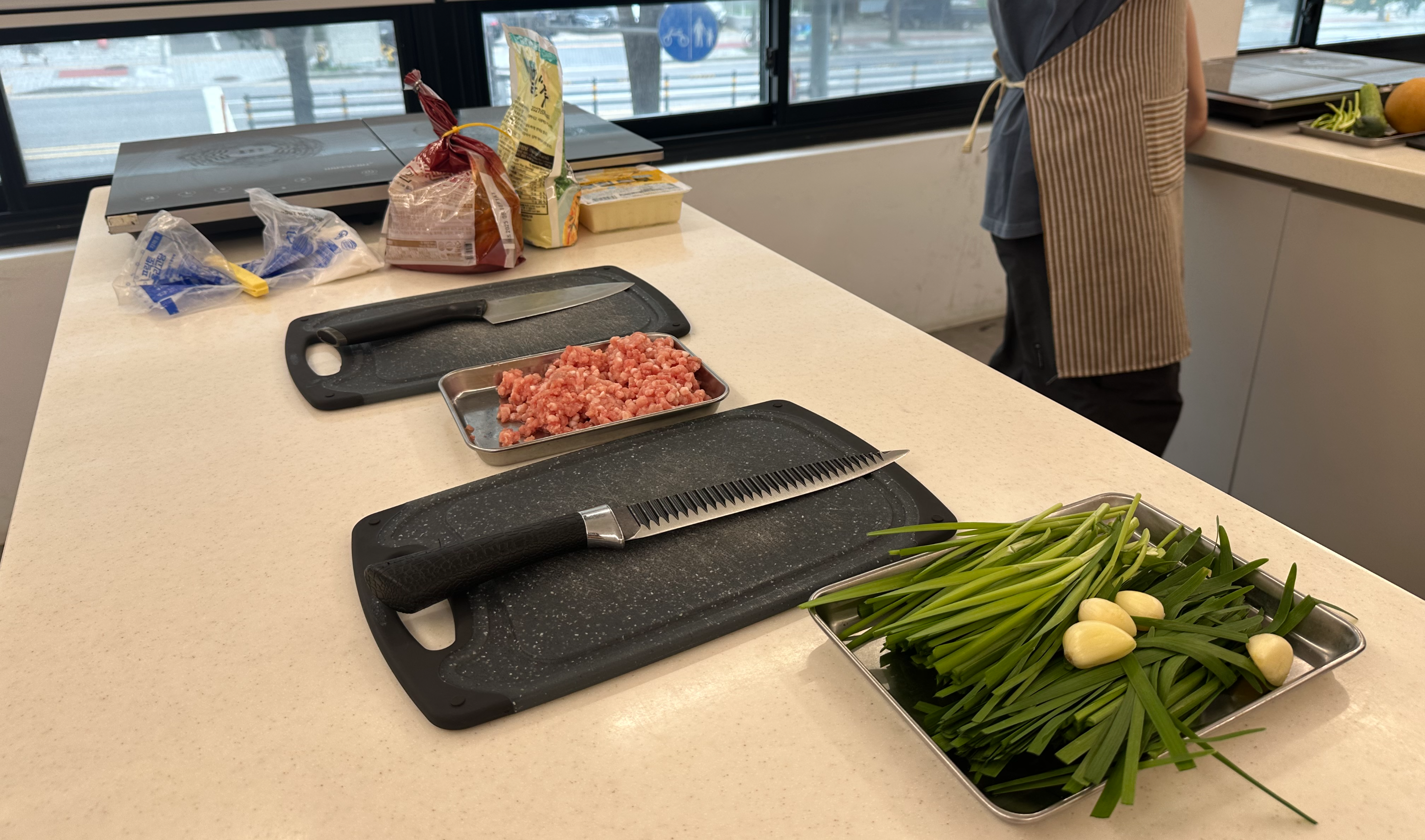 - 부추, 대파, 김치는 잘게 다집니다.