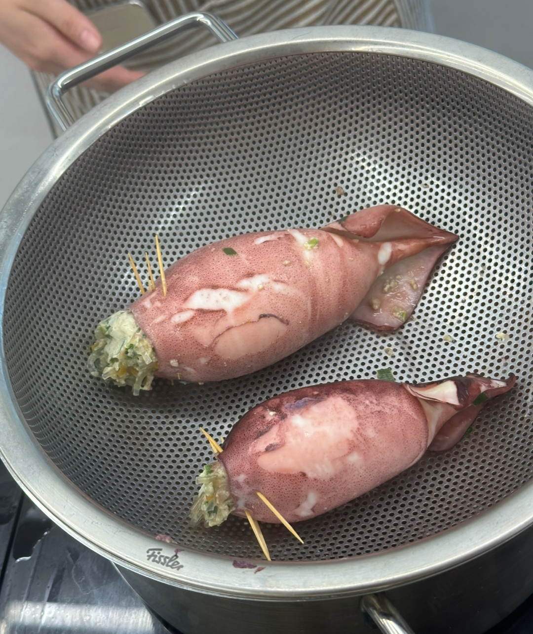 소를 4/5정도 채워넣고, 꼬치로 입구를 고정합니다. - 찜통에 속을 채운 오징어를 15분간 쪄서 익혀줍니다.