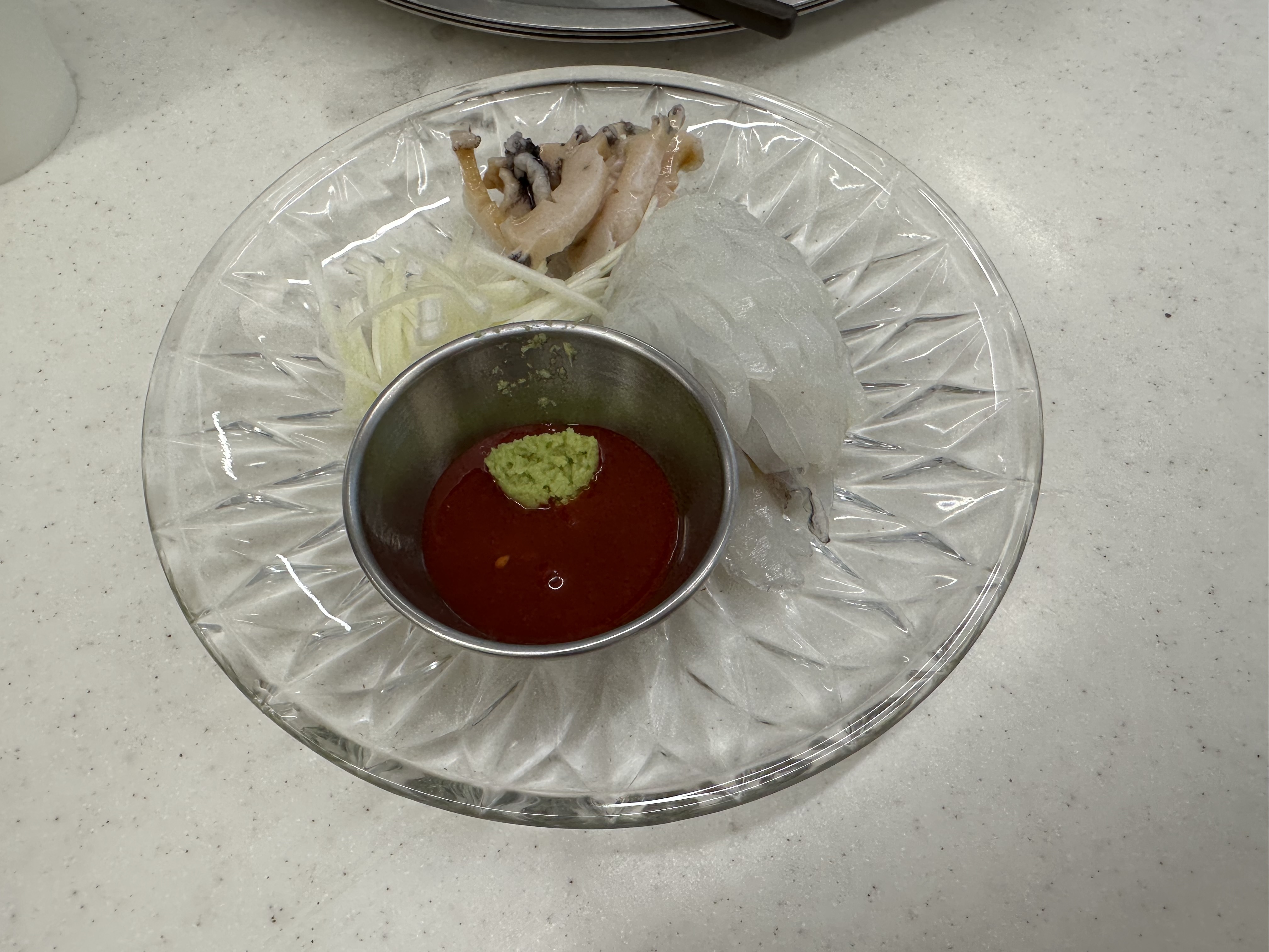 물회소스를 부워 담아준 뒤 배와 오이를 뿌려줍니다.