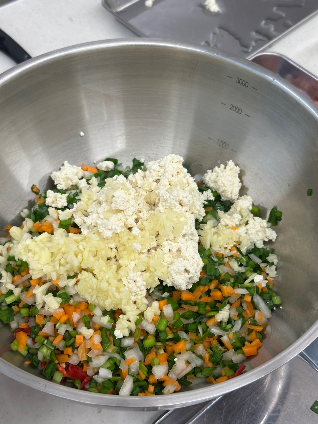 - 믹싱 볼에 볶은 재료를 넣고, 물기를 제거한 두부를 넣어 으깨줍니다.