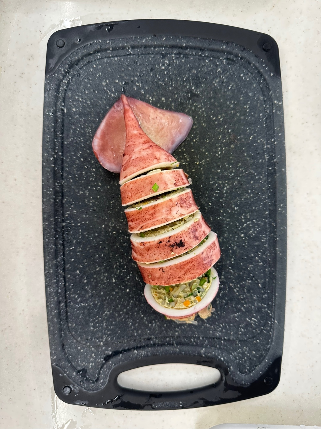 - 오징어는 배를 가르지 않고, 다리를 당겨 내장을 꺼내고 속을 깨끗이 씻어줍니다.