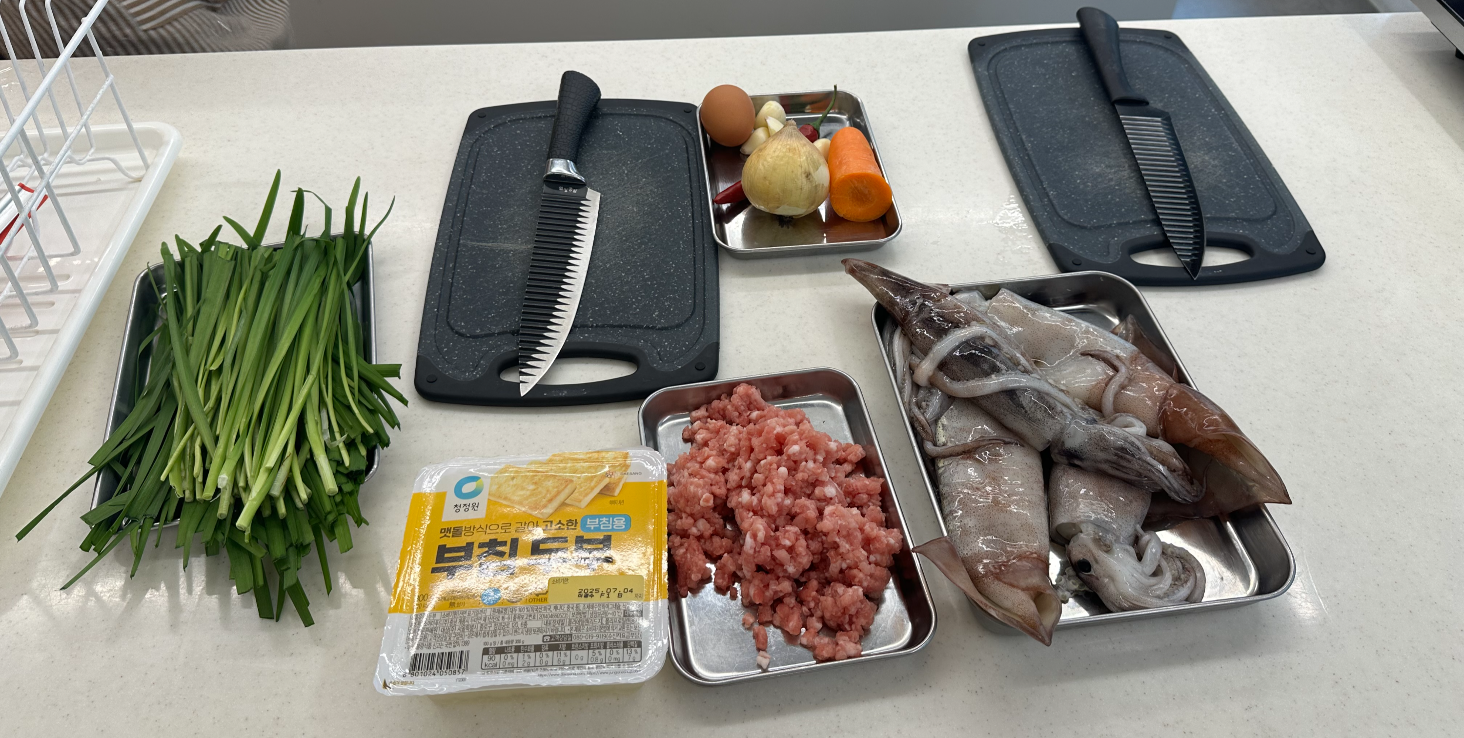 - 오징어 다리, 양파, 당근, 홍고추, 부추는 잘게 다져줍니다.