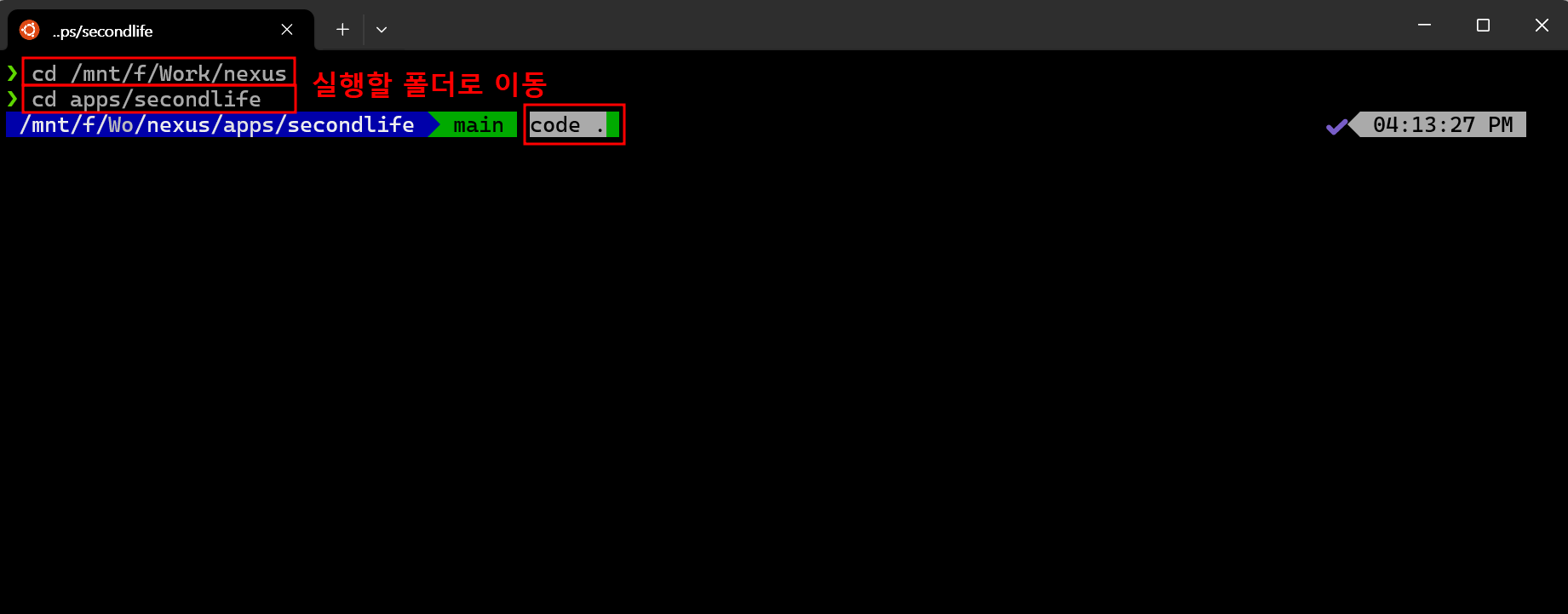 ③ 명령 프롬프트에서 원하는 디렉토리로 이동 후 code .명령어 입력