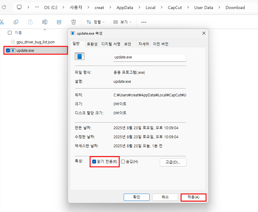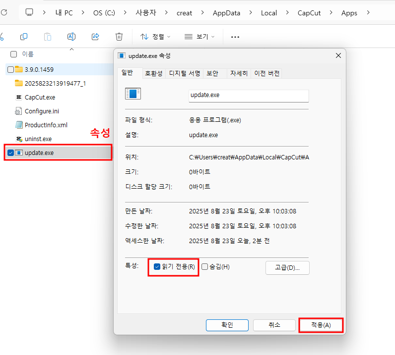 4. update.exe 속성 ▶ 읽기전용 ▶ 적용