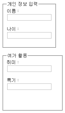 <fieldset> 태그는 폼 태그 안에 관련 있는 폼 엘리먼트들을 그룹화할 때 사용합니다.