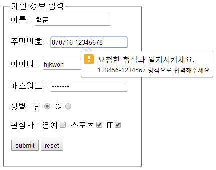 주민번호 입력 칸은 HTML5에서 추가된 pattern 속성을 사용하여 정규표현식에 맞는 정확한 값을 입력해야 합니다.