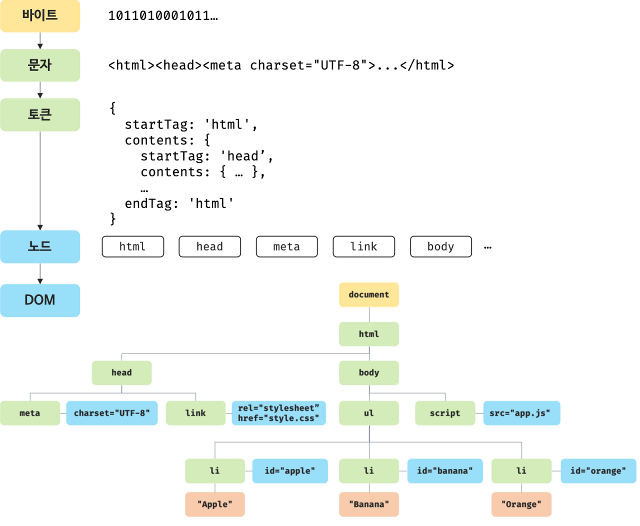 - HTML을 파싱하여 DOM 노드를 만든다. 이 DOM 노드들을 병합하여 DOM 트리를 만든다.