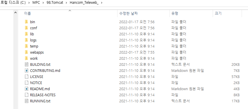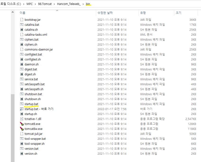 폴더명 src가 없다! ▶ 톰캣 > bin > startup.bat 으로 프로젝트 구동하면 됨!