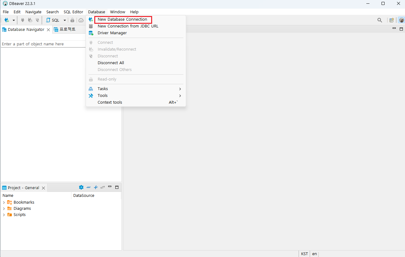 앞서 설치한 DBeaver 툴을 실행하고 Database -> New Database Connection을 선택한다.