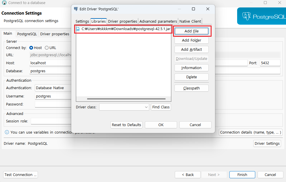 Add File을 선택해서 앞서 다운로드한 postgresql 용 jdbc를 선택한다.
