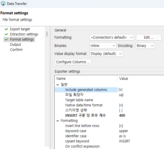 Format settings에서 Exporter settings를 건드릴 겁니다. include generated columns에 체크를 해 주는데요. 이는 id가 자동으로 생성되는 속성을 가지기 때문입니다. 이는 테이블에 있는 컬럼 정보를 확인해 보면 알 수 있습니다.