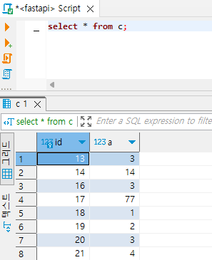 그러면 c_202303210032.sql로 결과 파일이 생성됩니다. 이제, fastapi 데이터베이스의 c 테이블에 그대로 옮겨보도록 하겠습니다.