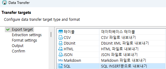 그러면 여러 Export 옵션들이 보입니다. 저는 여기서 SQL insert 문으로 내보내기를 클릭하겠습니다.